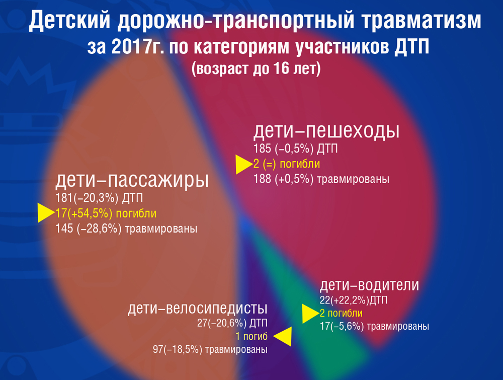 Сегодня положение с детским дорожно-транспортным травматизмом у Госавтоинспекции вызывает повышенное беспокойство. В настоящее время мы имеем трагические цифры статистики детского дорожно-транспортного травматизма. Несмотря на сокращение числа ДТП и раненых данной категории, в 2017 году 23 несовершеннолетних погибли в ДТП, показатель увеличился на 76,9%.