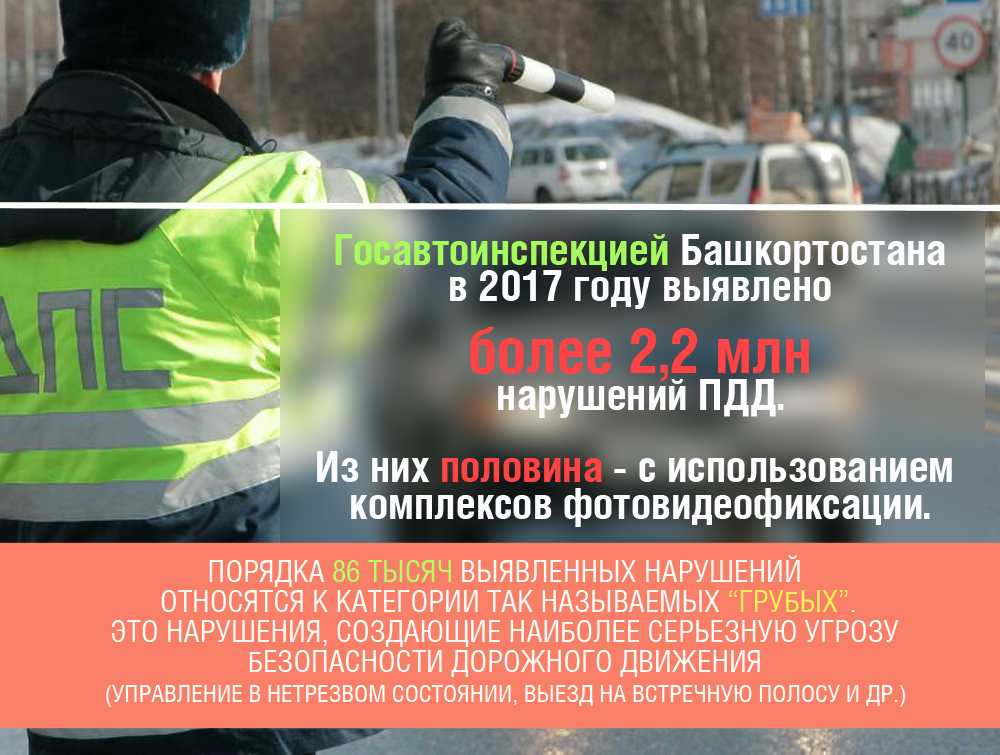 В 2017 году более 70 % от общего числа ДТП по вине водителей автобусов произошло на территории города Уфы. По республике пресечено более 167 тысяч нарушений ПДД водителями автобусов, в том числе задержаны 97 водителей за управление автобусами в состоянии опьянения, а также 40 водителей автобусов, лишенных права управления.