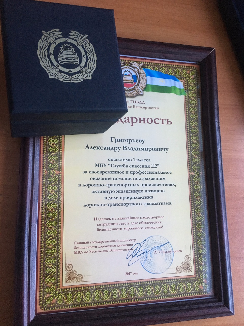 Александр Владимирович 26 ноября этого года оказал помощь пострадавшим в серьезной аварии на автодороге Уфа-Шакша. Александр в этот день находился не на работе. Однако его решительные и профессиональные действия позволили извлечь трех человек из двух столкнувшихся автомобилей. Последнюю, женщину - уже по прибытии на место вызванных им же коллег.