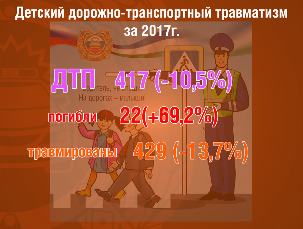 Сегодня положение с детским дорожно-транспортным травматизмом у Госавтоинспекции вызывает повышенное беспокойство. В настоящее время мы имеем трагические цифры статистики детского дорожно-транспортного травматизма. Несмотря на сокращение числа ДТП и раненых данной категории, в 2017 году 23 несовершеннолетних погибли в ДТП, показатель увеличился на 76,9%.