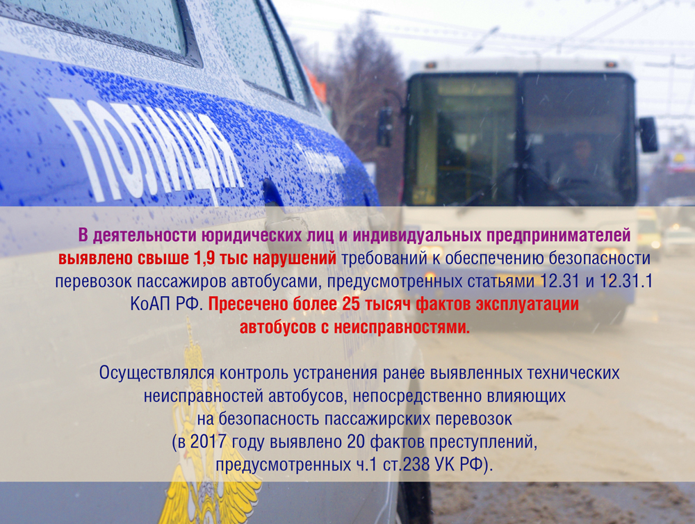 Осуществлялся контроль устранения ранее выявленных технических неисправностей автобусов, непосредственно влияющих на безопасность пассажирских перевозок (в 2017 году выявлено 20 фактов преступлений, предусмотренных ч.1 ст.238 УК РФ).