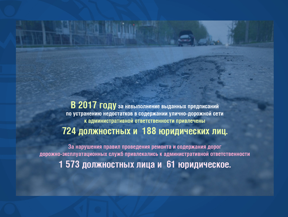 Выполняя задачу по реагированию на складывающееся положение, Госавтоинспекцией на устранение недостатков в содержании улично-дорожной сети республики выдано более 19 тысяч предписаний по недостаткам в содержании улично-дорожной сети республики. Приходится констатировать, что предписания на устранения не-достатков в содержании улично-дорожной сети не стали результативным инструментом этой работы. В 2017 году за невыполнение к административной ответственности привлечены 724 должностных и 188 юридических лиц. За нарушения правил проведения ремонта и содержания дорог дорожно-эксплуатационных служб привлекались к административной ответственности 1 тысяча 573 должностных лица и 61 юридическое.