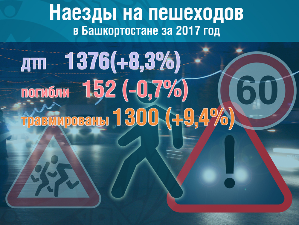 Пешеходы в настоящее время составляют одну из самых многочисленных категорий участников дорожного движения, получающих ранения и погибающих в ДТП. И, по-прежнему, много людей гибнет в качестве пеших участников дорожного движения: в прошлом году погибли 152 пешехода. Почти 77% смертельных случаев от общего числа погибших пешеходов зафиксированы в темное время суток. Каждый третий наезд на пешехода совершен на пешеходных переходах. В 2017 году число наездов на пешеходных переходах возросло на 33,45% (всего 438 ДТП).