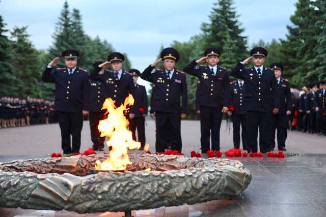 Руководство, ветераны министерства внутренних дел по Республике Башкортостан и члены Общественного cовета при МВД по РБ зажгли свечи и возложили цветы к мемориалу погибшим воинам.