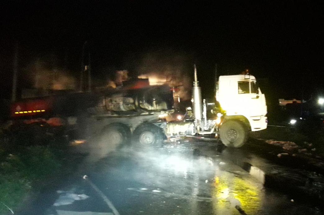 После этого произошло возгорание обоих автомобилей. В результате аварии неустановленный водитель, КаМАЗа с манипулятором, скончался на месте происшествия. От более масштабных последствий уберегло то, что бензовоз незадолго до аварии успел выгрузить перевозимые нефтепродукты. Его пассажир, 20-летний местный житель, с травмами доставлен в больницу.